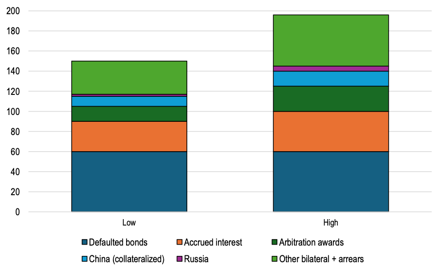 Low-high estimate; includes bonds, accrued interest, arbitration awards, bilateral claims, and arrears in USD billions