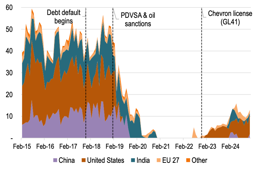 Export data illustrate how China’s role has evolved into a de facto buyer of last resort for Venezuelan oil. Following default and the imposition of PDVSA and oil sector sanctions, crude oil export volumes collapsed, and destinations narrowed sharply (Figure 2a). When U.S. purchases under Chevron’s license are excluded, China’s share of remaining exports rises markedly, underscoring its outsized role in the post-sanctions period (Figure 2b). While China’s absolute import volumes decline after sanctions, its share of Venezuela’s non-U.S. export market increases—reflecting reduced diversification.